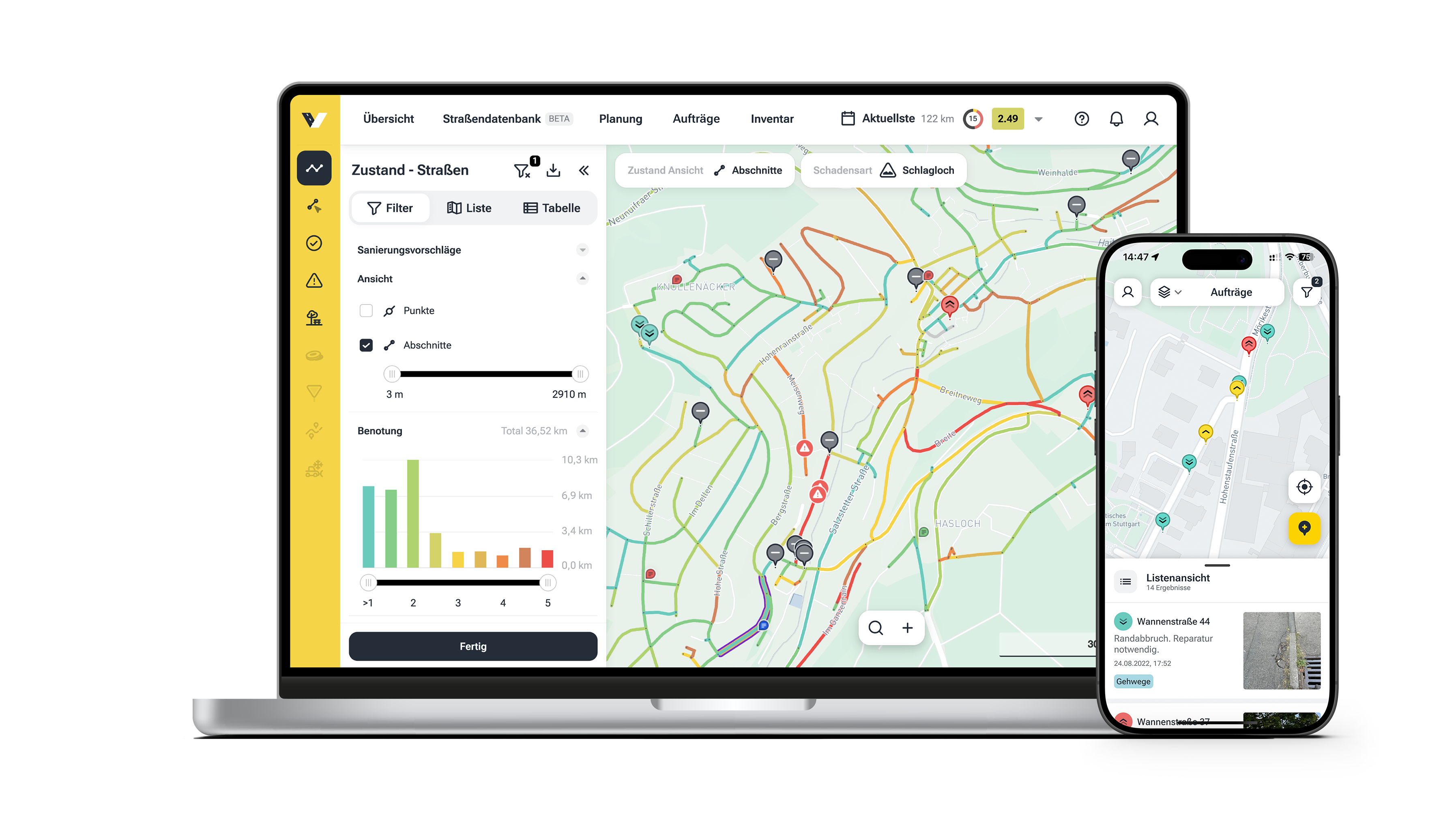 With our AI-based road management system, we help cities and municipalities digitally assess and efficiently maintain the condition of their roads. Our smart solution is not only forward-thinking but also scalable, allowing it to adapt flexibly to the needs of any region.
